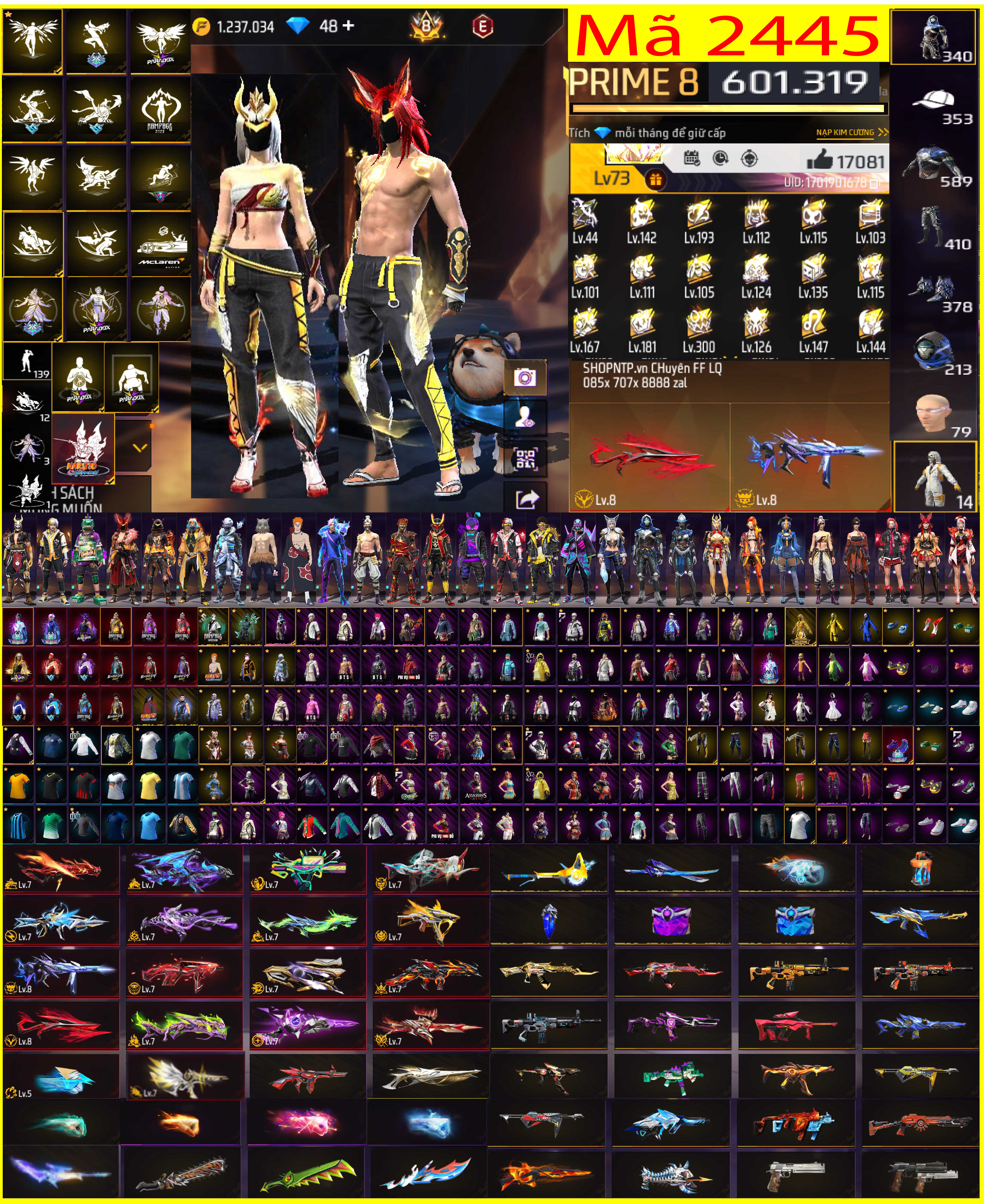 Mô tả: 5 cây 7 , 1 cây 6 , 1 cây 4 , vệ binh , thỏ , kim log , quỷ vương , lãng khách hề ..... dư 1872 kc , 26 thẻ tháng vip 8