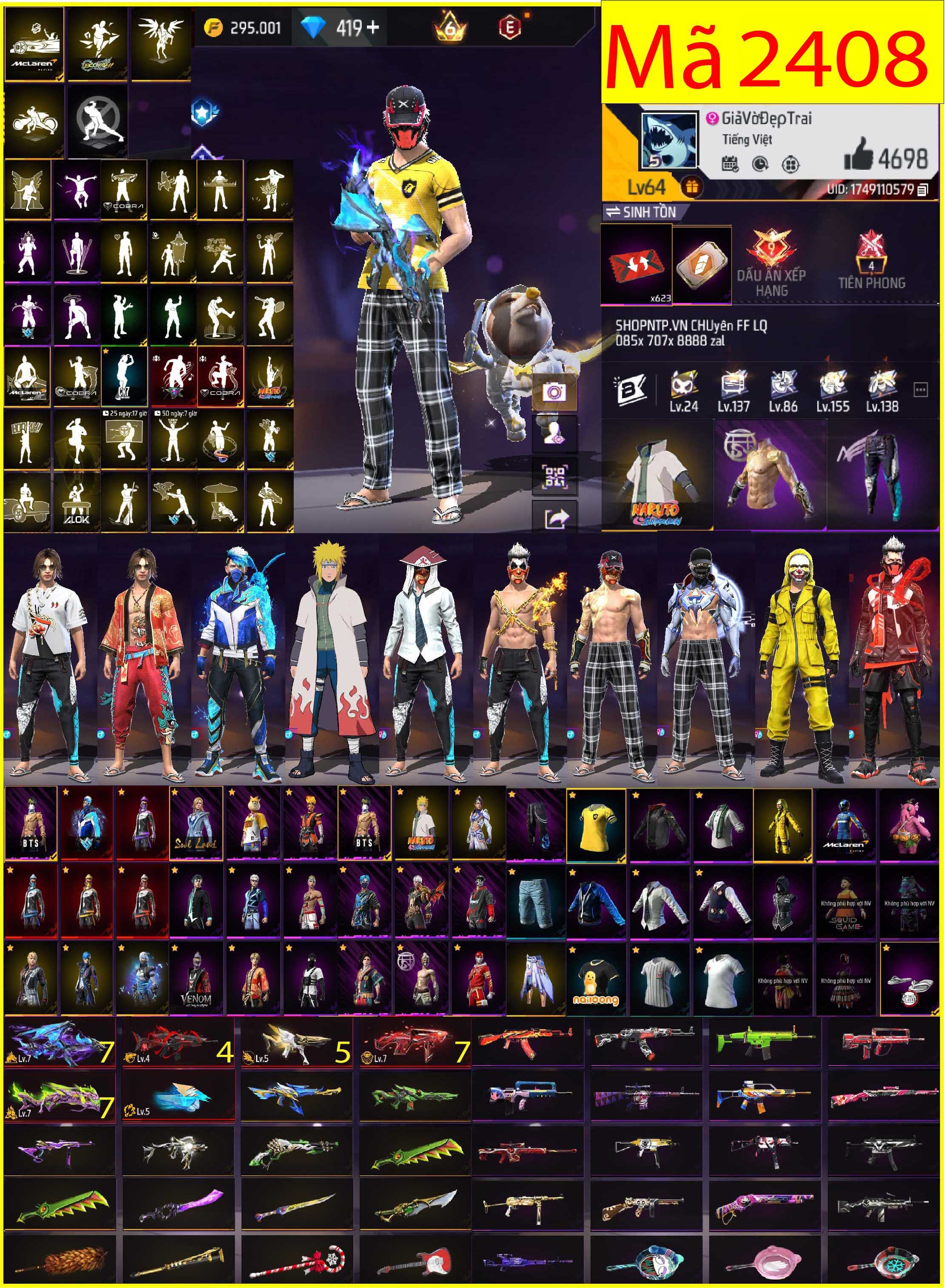 Mô tả: 2x sss , NAk , khỉ , Buf 5 , gần 600 skin , Full rip Số đổi