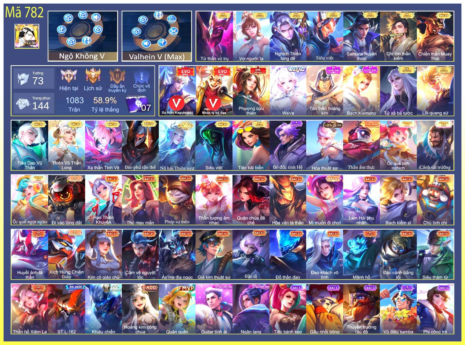 Mô tả: VIP 8 , Đồ Ngủ nè , lãng khách , nhiều đồ hót 2 cây 7 , 3 cây 6 , 1 cây 5 , 1 cây 4 dư 90 mảnh , 400 áo , lv 74 15k like , đấm nhất quyền